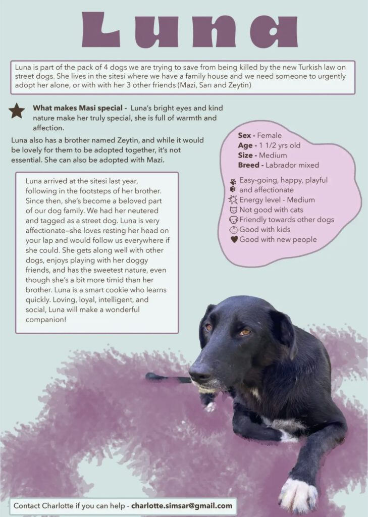 If you want to help, share this information, support local rescuers and animal welfare groups, and speak up for humane solutions. Every form of responsibility matters. We are looking for a foster or adopter for Luna, the black dog and also for the others in the pictures.